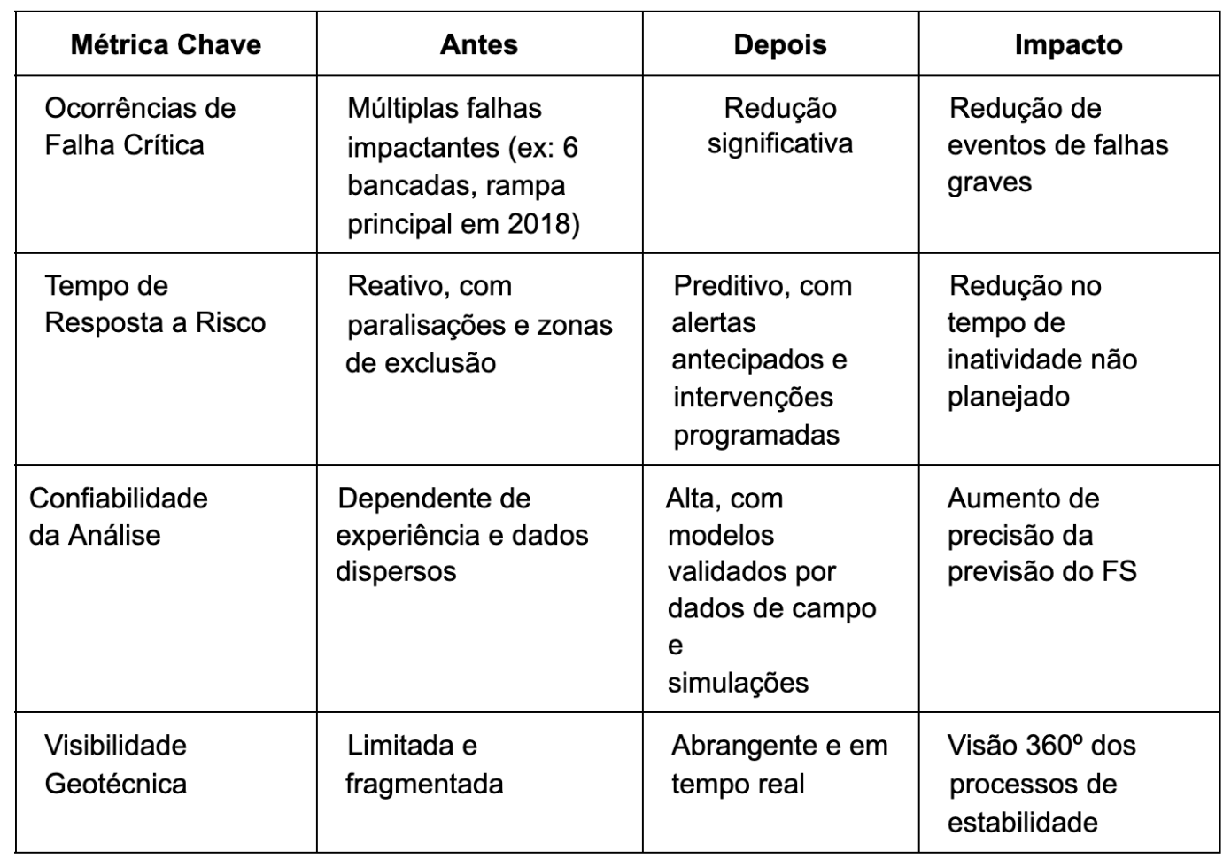 A implementação da solução trouxe uma transformação profunda na gestão da estabilidade de taludes para a mineradora, gerando valor tangível e demonstrável: